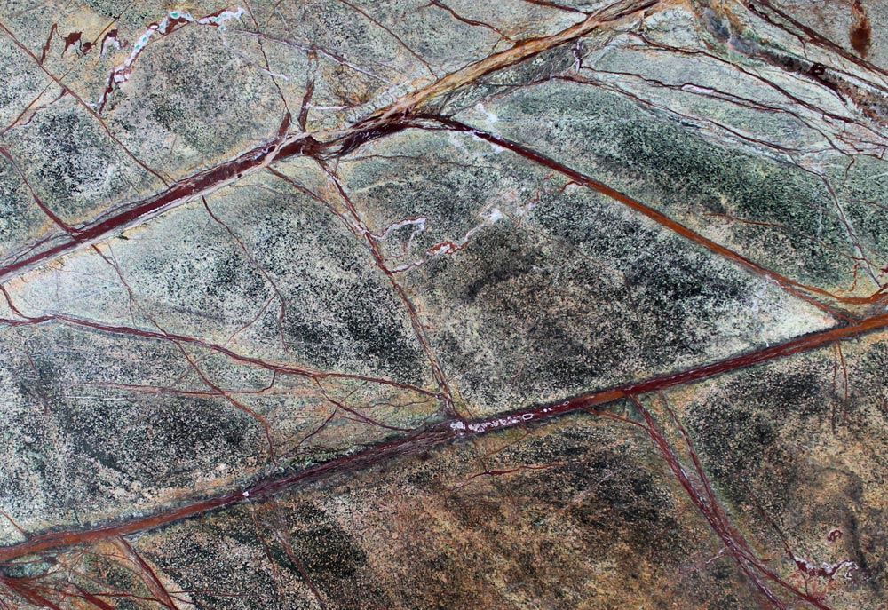 Основной фон может иметь десять различных оттенков зеленого, начиная от травяного и заканчивая салатовым. Сеть достаточно широких терракотовых прожилок - ни что иное, как включения глины. По такому характерному признаку можно определить, что перед вами порода мрамора из Индии.